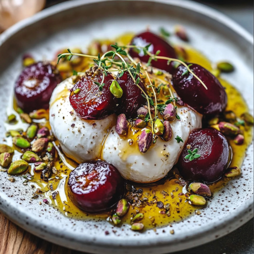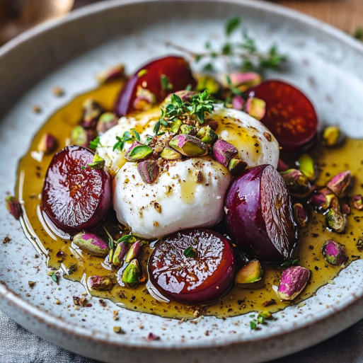 The Burrata with Roasted Plums, Pistachios & Thyme is a delightful dish that combines creamy burrata with the sweet and tangy flavor of roasted plums. This recipe is perfect for various occasions, whether it’s a casual gathering, a sophisticated dinner party, or simply a treat for yourself. The combination of textures—from the luscious cheese to the juicy plums and crunchy pistachios—creates an unforgettable experience for your taste buds.